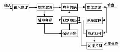 交流或直流的輸入電壓經(jīng)“輸入陷波”電路后到“整流濾波”電路,得到高壓(約300V)直流電壓。“功率轉(zhuǎn)換”將高壓直流逆變成約35kHz的高頻交流,經(jīng)高頻變壓器變換到輸出所需的電壓,再經(jīng)高頻整流濾波得到輸出電壓�?刂齐娐穼敵鲭妷汉洼敵鲭娏魅�,閉環(huán)反饋后產(chǎn)生脈寬調(diào)制(PWM)信號控制“功率轉(zhuǎn)換”電路,使輸出電壓或電流保持穩(wěn)定。