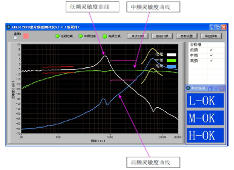 低頻輸出端的電壓值,得出高頻、帶頻、低頻的靈敏度曲線。