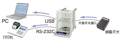 標(biāo)配RS-232C和USB接口,天平可同時連接:“電腦與打印機(jī)”、“電腦和數(shù)據(jù)記錄器”、“電腦和外部顯示器”兩種不同輸出設(shè)備。(另外還配備了外部開關(guān)接口)